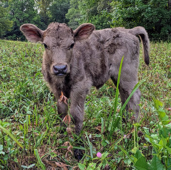 Murray Grey is a breed of beef cattle hailing from the Murray River valley in Australia. The breed originated from a cross between a Shorthorn cow and an Aberdeen Angus bull in the early 1900s. The breed is naturally polled and is known for its gentle temperament, ease of calving, excellent maternal instincts and efficient weight gain on grass, with carcass traits of high marbling and tenderness. In most cases calves are born ranging from light to dark grey, losing their grey as they grow and developing a coat that can be a variety of brown or black. A few adults may even have an almost silver appearance. In our experience, we've had grey calves and also one born completely white and one born with a black coat.